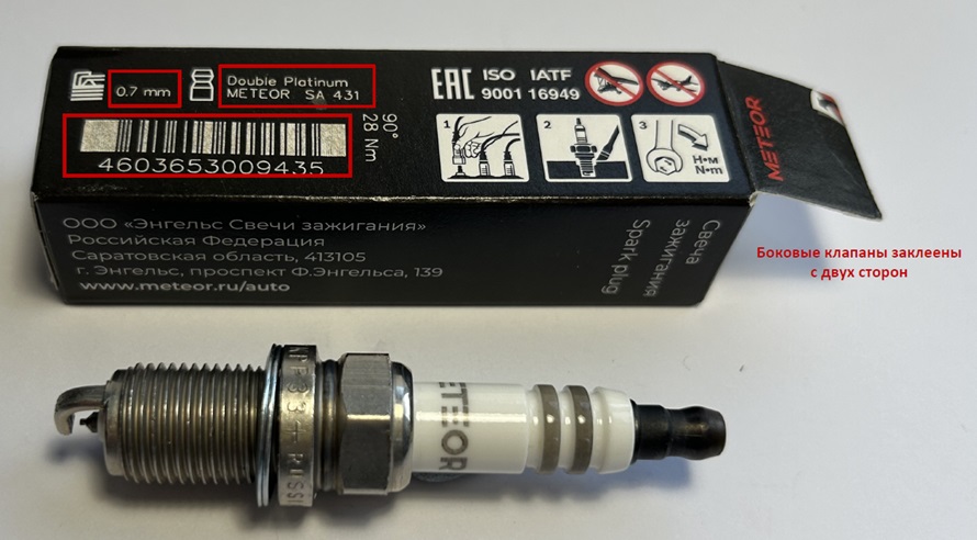 В связи с тем, что упаковка свечей зажигания METEOR производится на автоматических линиях, переменная информация (зазор, артикул) на индивидуальные упаковки наносится лазером (методом прожига, а не методом типографской печати) и сами упаковки невозможно вскрыть, не повреждая их (боковые клапаны упаковки заклеены)